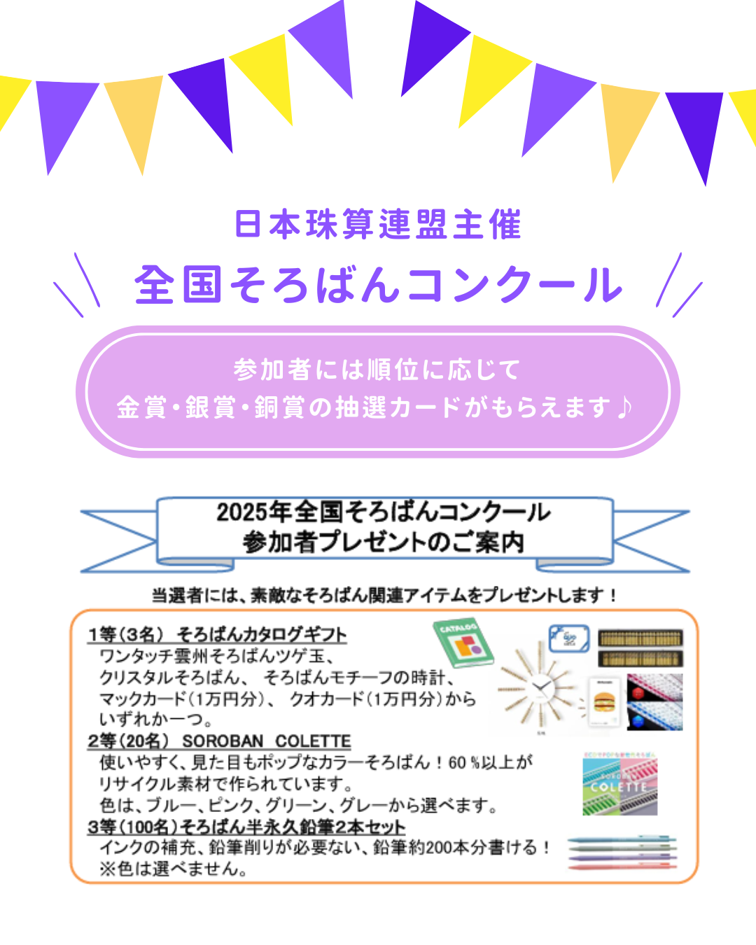 【全国そろばんコンクール申込締切のご案内】 ★10/13(月)までに申込をお願いいたします。 →お申し込み後、大会問題集をお送りいたします。 今回特別に七五三珠算塾限定で、得点に応じた景品もつきますので挑戦してみたい方はぜひご参加ください✨ ご不明点等ありましたら、お気軽にライン公式にご連絡下さいませ。 |